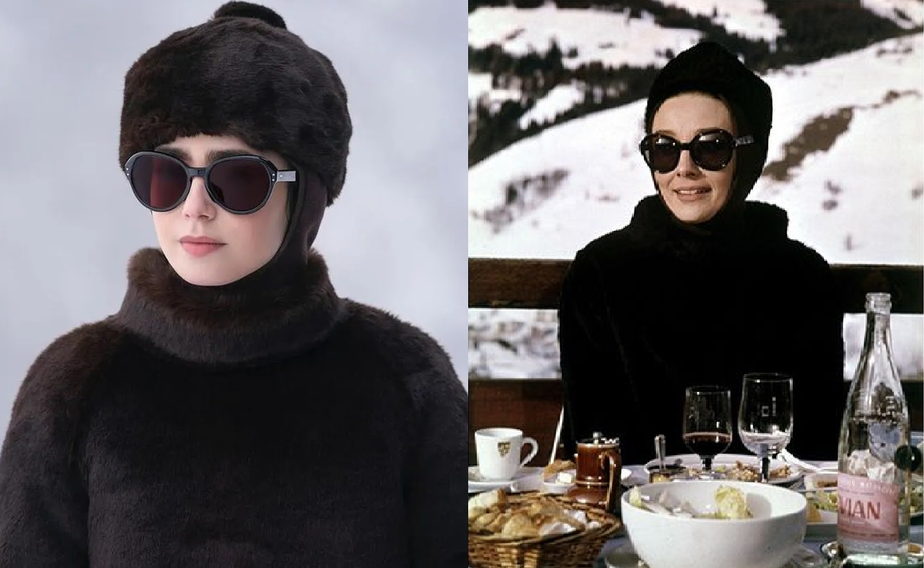 Primeiramente, vale a menção a esta imagem, que remete à famosa pose de Audrey Hepburn cercada de neve, que se tornou icônica décadas atrás. Uma cena recriada por Lily Collins, respeitando até os detalhes do visual, desde o chapéu de pele até o casaco marrom chocolate com óculos escuros.
