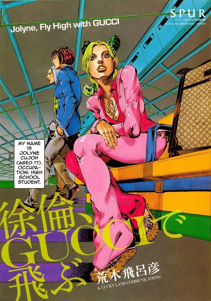 - GUCCI X JOJO – este foi o nome da colaboração de 2013. E desta vez, a estrela foi Jolyne Kujo, única protagonista feminina da franquia até hoje. Além das artes, Araki também criou um mangá one-shot publicado novamente na Spur e nomeado de “Jolyne, Fly High with GUCCI”. A diferença é que dessa vez suas artes não ficaram restritas ao Japão, sendo expostas em mais de 70 lojas GUCCI ao redor do mundo.