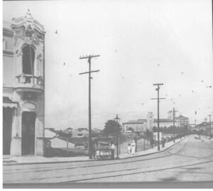 Viaduto Santa Efigênia pouco tempo após sua construção, ainda feito para o trânsito de carros e bondes